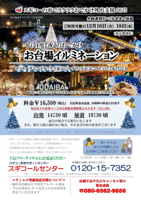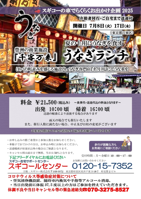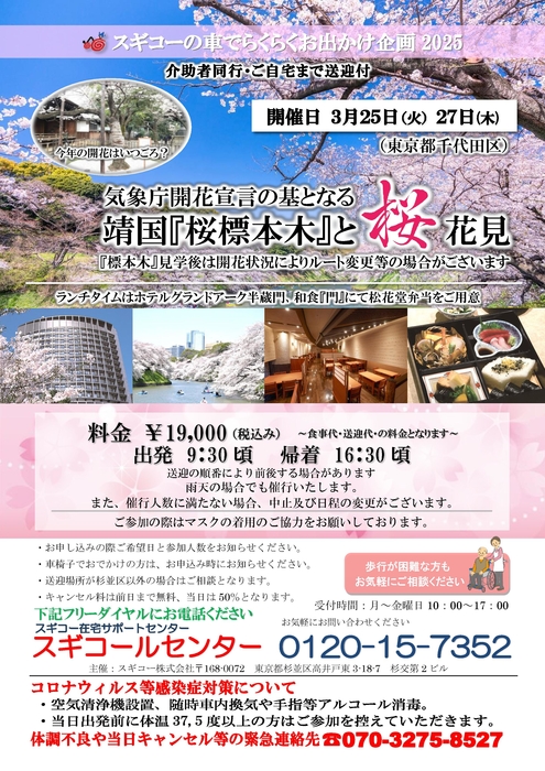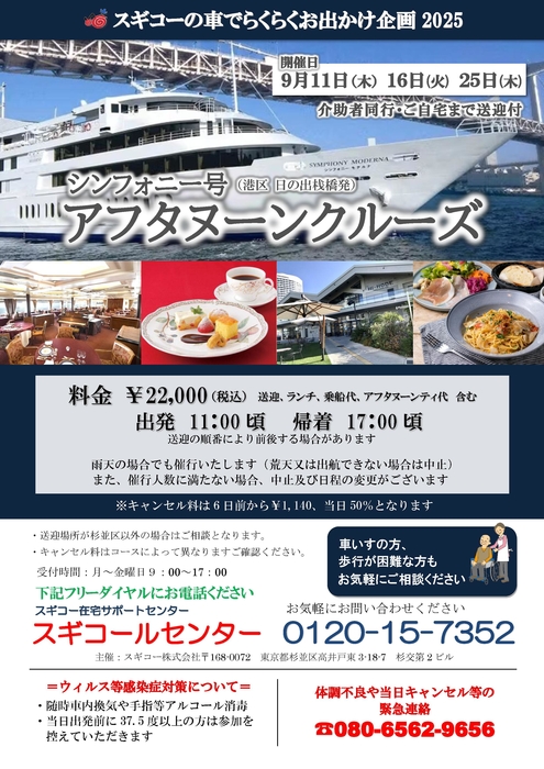身体の不安があっても諦めることなく楽しんでいただきたい、という願いがこもったスギコーならではの企画です。お家までの送迎、すべての移動やシーンでサポートいたしますので、安心してご利用下さい。~「思い切ってでかけましょう‼」~